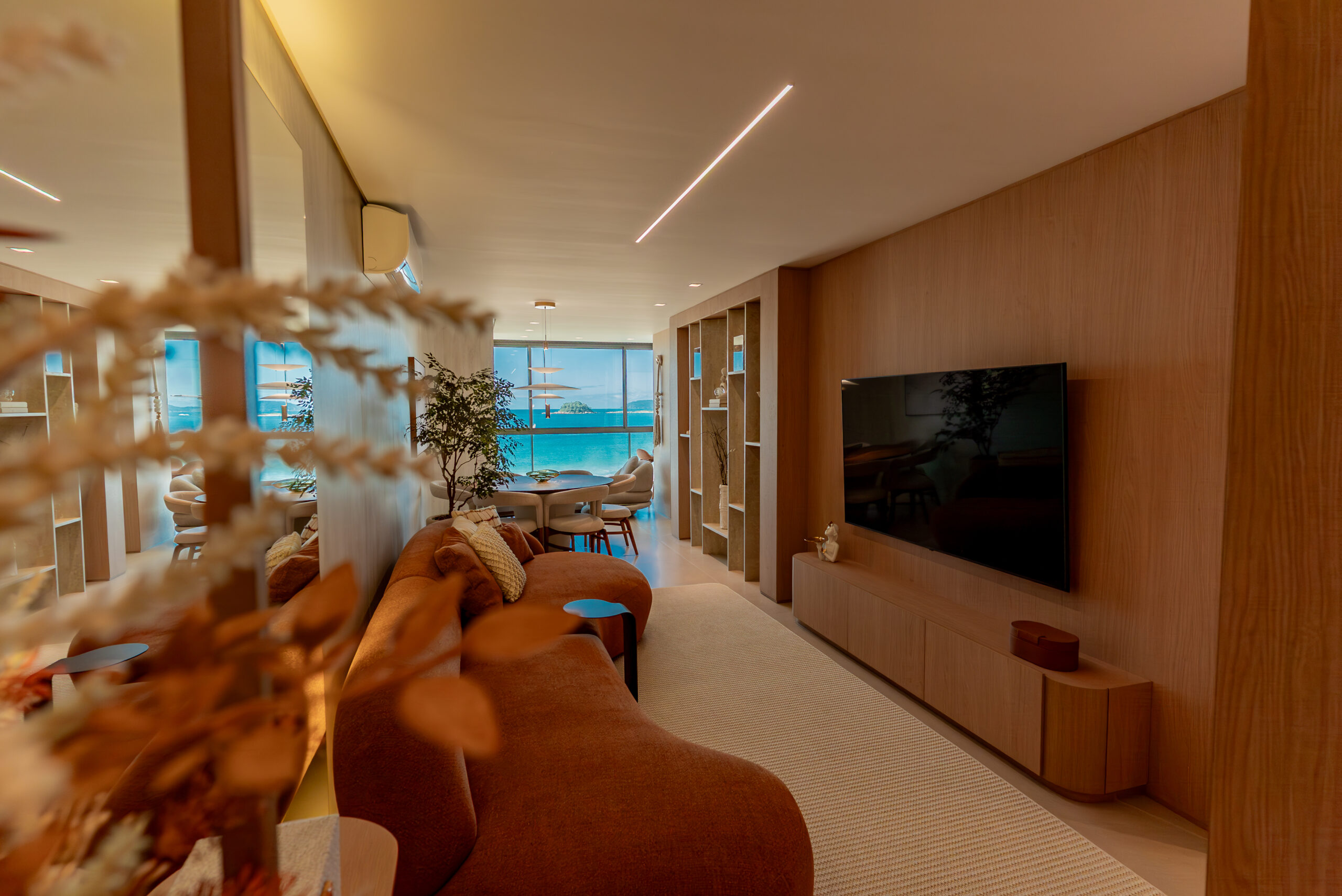 A madeira clara aparece com destaque em diferentes pontos, reforçando a sensação de acolhimento. As formas orgânicas do mobiliário e a escolha de peças assinadas trazem equilíbrio entre estética e funcionalidade. A sacada, com vista para o mar, é um convite ao descanso, com móveis leves, vegetação natural e ventilação cruzada.